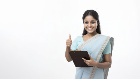 Indian woman standing and holding a clipboard showing a thumbs up gesture job candidate theme