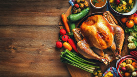 Beautifully crafted table setting with traditional thanksgiving dinner featuring roasted turkey