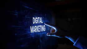A hand touching a virtual screen displaying digital marketing, symbolizing interaction, online strategies, technology engagement