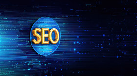 The word seo in shiny golden letters is displayed on a blue circuit board against a dark blue backdrop, representing technology and innovation, technology innovation, digital marketing