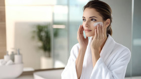 Woman in white robe looking at herself hands on face suggesting skincare and beauty