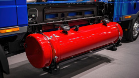 red natural gas tank mounted blue van wheels truck show exhibition cng vehicle cng cars cng fuel cng auto cng trucks cng truck display energy clean fuel system transportation infrastructureImagine Buddy