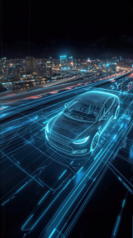 A hologram of an electric car on a highway surrounded by digital lines and futuristic elements, symbolizing cng vehicle innovation, electric car, future transport