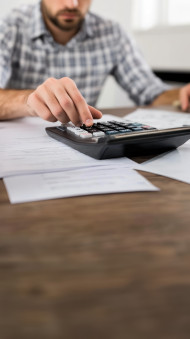 Man sitting at his desk with papers and coffee mugs working with an expressionless face