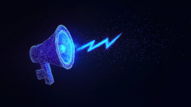 Low poly megaphone with a lightning bolt, blending sound design with powerful energy, abstract megaphone, lightning effects, audio mixing