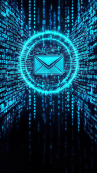 Blue digital background with email icon surrounded by binary code, representing drip campaigns, data driven marketing, automated communication