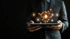 Businessman using a tablet with floating human avatars around it, representing funnel optimization, customer engagement, sales leads, and digital lead magnets