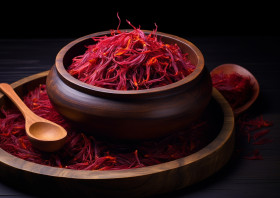 Saffron in wooden bowl with red color on dark background, saffron flower image