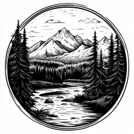 mountain river woodcut monochrome engraving art landscape nature vintage rustic hills illustration carving textured etching classic blackandwhite scenic countryside minimalist traditional serene detailedImagine Buddy
