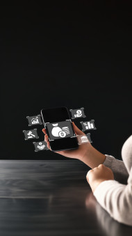 Woman holds a phone displaying tax with floating icons, the concept highlights tax services, digital tools, and retirement strategies