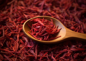 Red saffron leaves on a wooden spoon, saffron flower imag