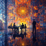 team discussing strategies office high-rise fractal art composition business creativity wallart artwork digital pattern corporate collaboration modern brainstorming professional abstract intricate illusion symmetry fractalart teamwork organization meeting vision innovation success leadership workspace perspective depth complexityImagine Buddy