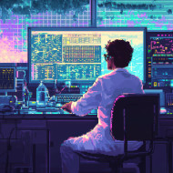 lab technician analyze data research science modern experiment medical innovation retro pixel art drawing maker digital technology laboratory precision discovery expertise testing development chemical process workspace advancement analysis microscope study formula engineering results knowledge scientistImagine Buddy