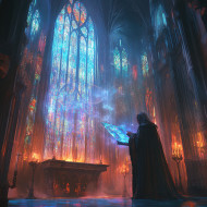 lab technician working holographic data medieval robes gothic architecture pointed arches stained glass windows chiaroscuro lighting art theme technology science research futuristic digital medical laboratory experiment science fiction innovation technology lab worker futuristic work modern data visualization screens virtual gothic artworkImagine Buddy