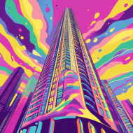 A modern skyscraper rises against a city skyline, its glass reflecting the urban landscape, towering architecture symbolizes progress, funk art style adds a bold, creative twist to the cityscape