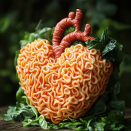 The heart is carved from noodles symbolizing love and emotion, concept art with intricate details and artistic flair, perfect for conveying passion through unique 3d concept art