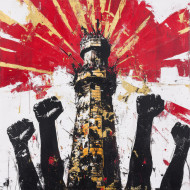 A tower crowned with raised fists, standing as a monument to unity and strength, embodying revolutionary art and the power of collective action in times of revolution