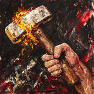 Workers’ hands forging a blazing hammer, a symbol of labor and revolution, in revolutionary artwork, representing the strength and unity of workers in the revolutionary movement
