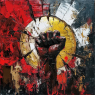 A shattered coin with a rising fist, symbolizing the break from old systems of wealth and power, in revolutionary art, emphasizing the fight for equality and justice in revolutionary war art