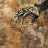 The inner workings of a robotic hand in a cave painting, imagining early technological advancements, inspired by the ancient art of chauvet cave and lascaux cave paintings