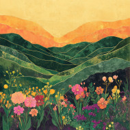 Rolling green hills bathed in golden sunrise light creating a dreamy landscape, this digital collage blends nature’s beauty with abstract textures in a unique digital picture collage style
