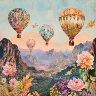 Hot air balloons floating over a scenic valley capturing adventure and freedom, this digital picture collage blends vibrant colors and dreamy textures for a unique digital collage artwork