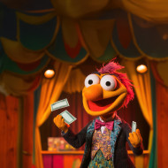 A silly banker puppet tosses money in the air with excitement and laughter, custom muppet style puppet making finance playful, muppet style, muppet style puppet