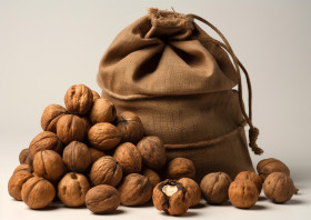Walnuts in a burlap bag with holes and nuts, walnuts image