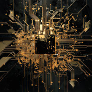 A shattered circuit board fused with gold, merging kintsugi, kintsugi pottery, and kintsugi art, representing technology, restoration, and innovation