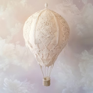 A lace designed hot air balloon floating gracefully detailed with delicate patterns, travel and adventure made of lace, lace made collection, elegant aviation concept