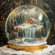 A frozen waterfall flows in a pine forest inside a snowglobe, surrounded by snow, the winter wonderland scene evokes a peaceful, magical moment perfect for a christmas snow globe