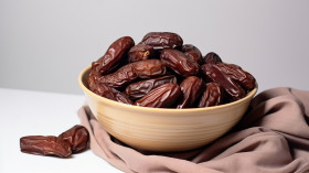 Dates in a brown bowl on white, sweet dates image