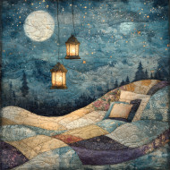 Lanterns floating under a moonlit sky glowing softly as they rise, nestled within a quilted bedspread, peaceful night scene, quilted, duvet covers