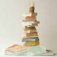A stack of coins with a rising graph designed from papier mache, the financial theme represents growth and success, paper mache paper and pulp economic concept