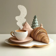 coffee cup steaming croissant morning cozy scene papier mache paper pulp food art handmade crafted artistic detailed breakfast aroma pastry warm realistic inviting traditional beverage delicious tabletop realistic texture peaceful still life artistic bakery delicate handcrafted roasted delightfulImagine Buddy