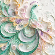 Vibrant peacock with flowing curled feathers designed in quilling art, intricate paper quilling forms elegant plumage, showcasing the beauty of this majestic bird