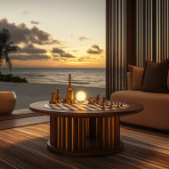 Breathtaking sunset over a tropical shore with palm trees and golden waves, relaxing theme for board game, monopoly, best board games fun