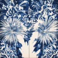 Fireworks bursting in patterns in blue and white tile, azulejo style. vibrant credence azulejos with azulejo arabesco motifs, celebrating joy and festivity