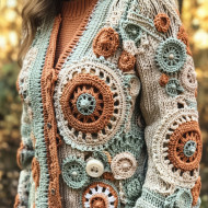 Gears interlocked in soft detail wearing a beautifully detailed crochet top cardigan, handmade crochet patterns, cozy industrial inspired decor, soft mechanical design