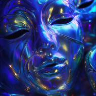 Carnival glass masks reflecting festival lights, glowing with vibrant hues and detailed craftsmanship, elegant carnival glass vase, acorn carnival glass artistic decor piece