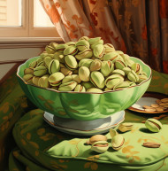 A bowl of green pistachios, pistachio nut image