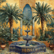 Palm trees swaying gently over tiled fountains, their reflections shimmering in water, arabesque floral patterns enhance the serene, elegant setting