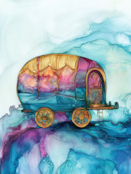 Caravan fading into dreamy ink horizons, silhouettes dissolving into soft swirling tones, a mystical desert journey in alcohol ink, alcohol ink painting, alcohol ink markers