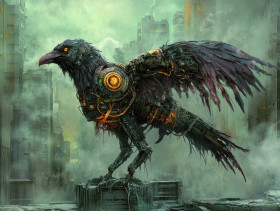 Rusted mechanical raven with tattered wings perches on a corroded beam, its eerie red eyes glowing, a haunting vision of decay and survival in a necropunk world