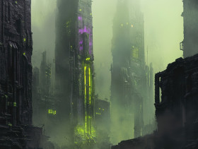 necropunk gothic towers dark sky biomechanical decay twisted metal bone merge haunting city ruin dystopia cybernetic industrial eerie horror mechanical futuristic nightmare apocalyptic decayed skyline corrupted architecture towering sinister abandoned metropolis shadow ominous structure ruinedImagine Buddy