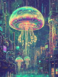glowing ocean robotic jellyfish pulsing neon light futuristic marine creatures drift atompunk underwater world cyber sci fi cybernetic advanced synthetic glowing sea high tech luminous cyber aquatic cyber life digital marine biology surreal fantasy cyber ecosystem atompunk clothes atompunk poster glowing creatures bioluminescence technology future innovationImagine Buddy