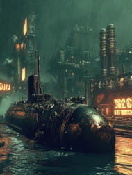 stormy shore abandoned submarine rusted hull battered waves remnants forgotten past dieselpunk maritime industrial ocean dystopian dark mysterious mechanical wreckage futuristic technology vintage retrofuturism sea steampunk cyber sci fi shipwreck history naval engineered brass storm weatheredImagine Buddy