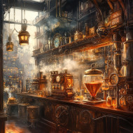 steampunk tea bar steam brewing machines hissing pressure customers brass cups retro vintage victorian mechanical technology cyberpunk beverage elegant invention sci fi automaton glowing relaxation futuristic detailed automation warm social innovation clockwork atmosphere cozy industry leisure refinedImagine Buddy