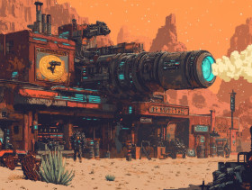 Iron fisted machines churn, spitting smoke and sparks, gears grinding as they power a relentless westernpunk industry