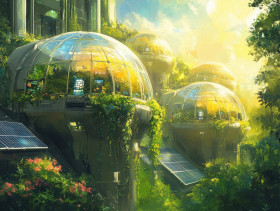 floating greenhouse domes solar energy urban agriculture water solarpunk aesthetic movement renewable farming future sustainability eco innovation nature green environment futuristic modern self sufficient technology city hydroponic aquatic vegetation clean architectural harmony design floating farm power developmentImagine Buddy